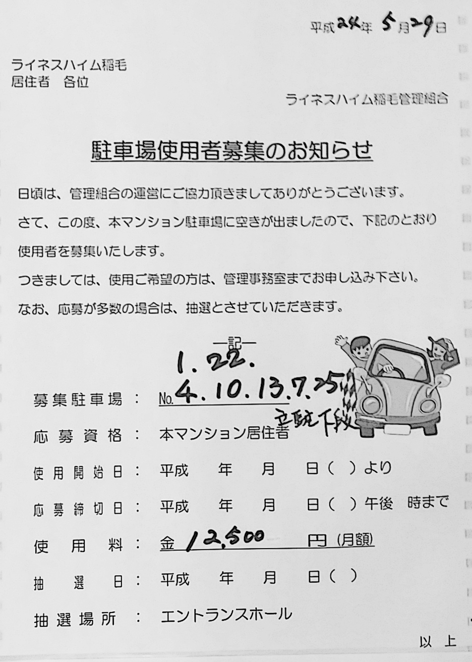 駐車場の空きが増えているようで、大量に使用者募集が出ています。